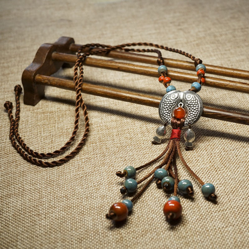 Tibetan Whitebait Ethnic Ancient Jewelry Original Ceramic Necklaces Vintage Natural Stone Pendant Cotton Long Tassel Necklace